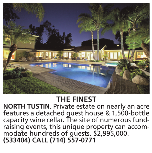 THE FINEST NORTH TUSTIN. Private estate on nearly an acre features a detached guest house & 1,500-bottle capacity wine cellar. The site of numerous fundraising events, this unique property can accommodate hundreds of guests. $2,995,000. (533404) CALL (714) 557-0771
