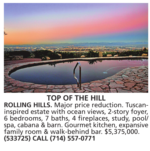 TOP OF THE HILL ROLLING HILLS. Major price reduction. Tuscaninspired estate with ocean views, 2-story foyer, 6 bedrooms, 7 baths, 4 fireplaces, study, pool/ spa, cabana & barn. Gourmet kitchen, expansive family room & walk-behind bar. $5,375,000. (533725) CALL (714) 557-0771