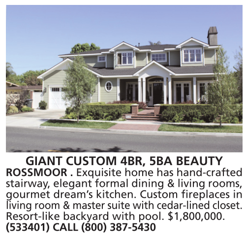 GIANT CUSTOM 4BR, 5BA BEAUTY ROSSMOOR . Exquisite home has hand-crafted stairway, elegant formal dining & living rooms, gourmet dream’s kitchen. Custom fireplaces in living room & master suite with cedar-lined closet. Resort-like backyard with pool. $1,800,000. (533401) CALL (800) 387-5430