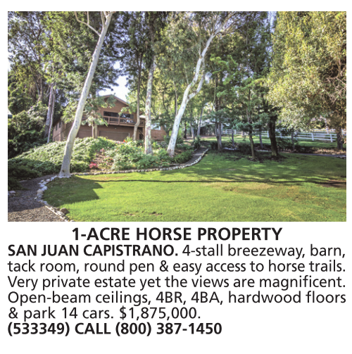 1-ACRE HORSE PROPERTY SAN JUAN CAPISTRANO. 4-stall breezeway, barn, tack room, round pen & easy access to horse trails. Very private estate yet the views are magnificent. Open-beam ceilings, 4BR, 4BA, hardwood floors & park 14 cars. $1,875,000. (533349) CALL (800) 387-1450