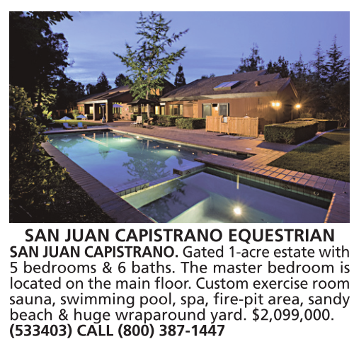 SAN JUAN CAPISTRANO EQUESTRIAN SAN JUAN CAPISTRANO. Gated 1-acre estate with 5 bedrooms & 6 baths. The master bedroom is located on the main floor. Custom exercise room sauna, swimming pool, spa, fire-pit area, sandy beach & huge wraparound yard. $2,099,000. (533403) CALL (800) 387-1447