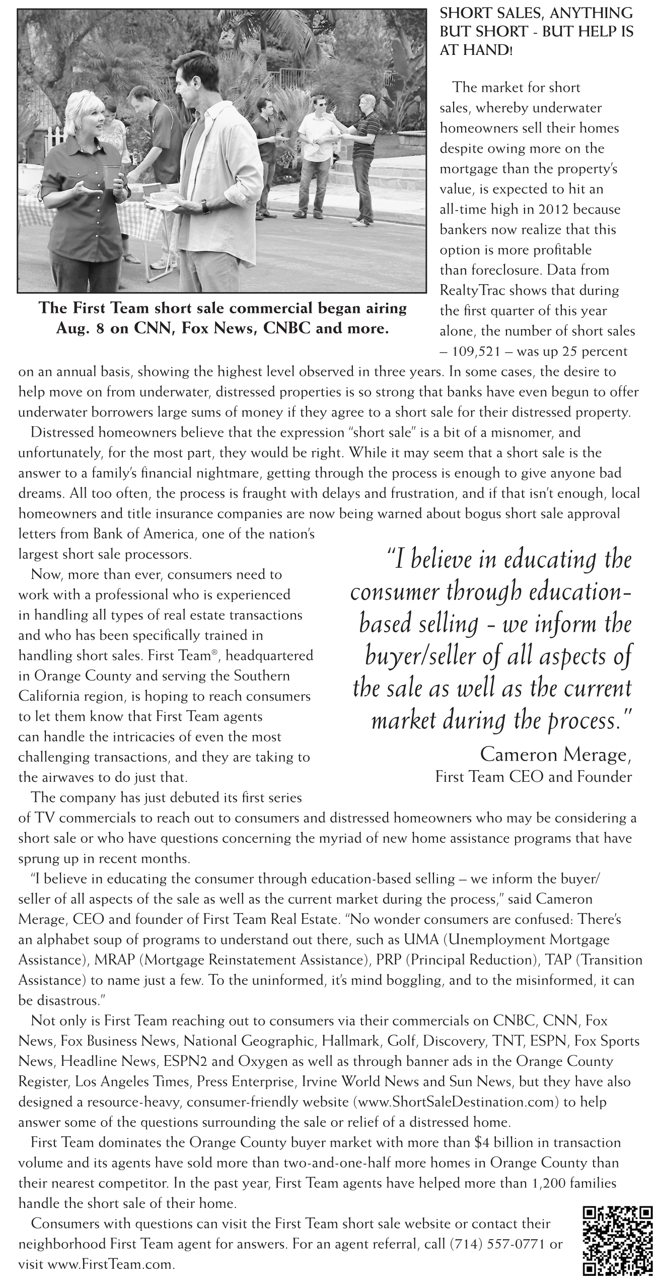 Not only is First Team reaching out to consumers via their commercials on CNBC, CNN, Fox News, Fox Business News, National Geographic, Hallmark, Golf, Discovery, TNT, ESPN, Fox Sports News, Headline News, ESPN2 and Oxygen as well as through banner ads in the Orange County Register, Los Angeles Times, Press Enterprise, Irvine World News and Sun News, but they have also designed a resource-heavy, consumer-friendly website (www.ShortSaleDestination.com) to help answer some of the questions surrounding the sale or relief of a distressed home.