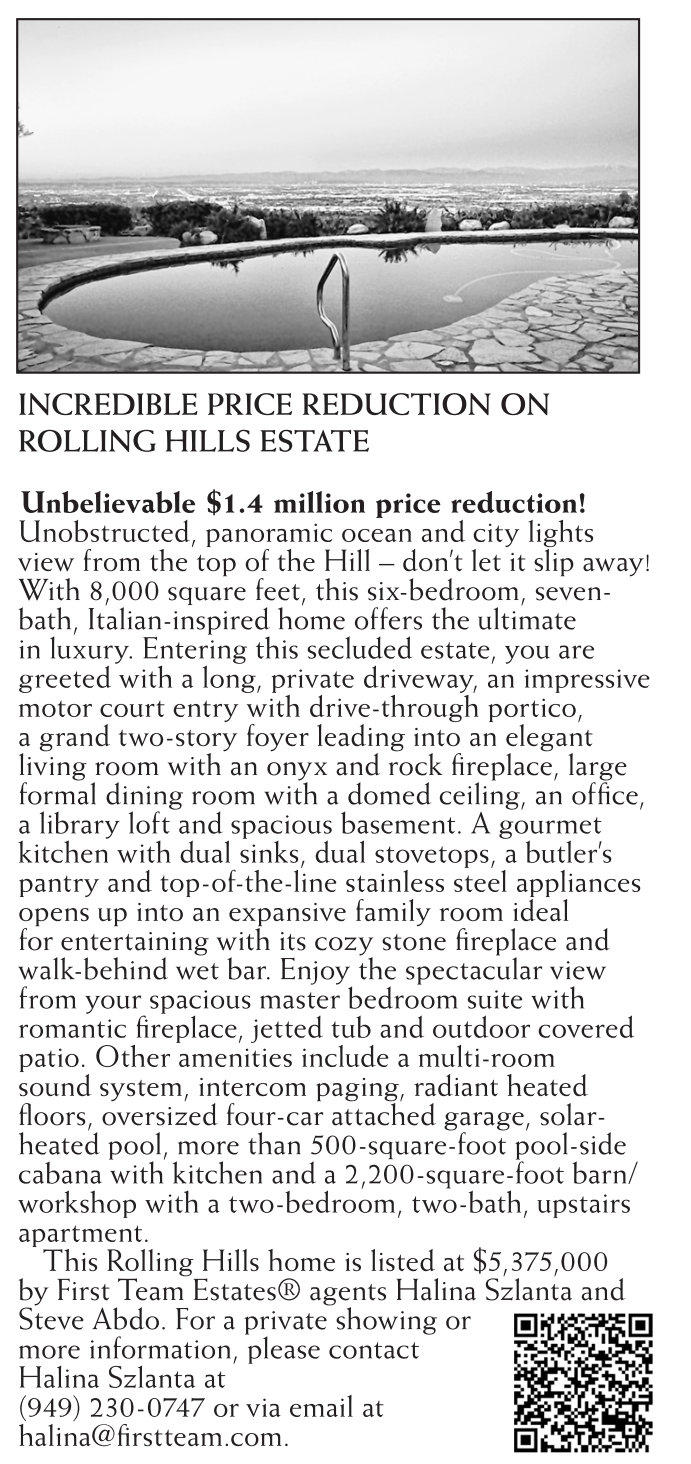 INCREDIBLE PRICE REDUCTION ON ROLLING HILLS ESTATE Unbelievable $1.4 million price reduction! Unobstructed, panoramic ocean and city lights view from the top of the Hill – don’t let it slip away! With 8,000 square feet, this six-bedroom, sevenbath, Italian-inspired home offers the ultimate in luxury. Entering this secluded estate, you are greeted with a long, private driveway, an impressive motor court entry with drive-through portico, a grand two-story foyer leading into an elegant living room with an onyx and rock fi replace, large formal dining room with a domed ceiling, an offi ce, a library loft and spacious basement. A gourmet kitchen with dual sinks, dual stovetops, a butler’s pantry and top-of-the-line stainless steel appliances opens up into an expansive family room ideal for entertaining with its cozy stone fi replace and walk-behind wet bar. Enjoy the spectacular view from your spacious master bedroom suite with romantic fi replace, jetted tub and outdoor covered patio. Other amenities include a multi-room sound system, intercom paging, radiant heated floors, oversized four-car attached garage, solarheated pool, more than 500-square-foot pool-side cabana with kitchen and a 2,200-square-foot barn/ workshop with a two-bedroom, two-bath, upstairs apartment. This Rolling Hills home is listed at $5,375,000 by First Team Estates® agents Halina Szlanta and Steve Abdo. For a private showing or more information, please contact Halina Szlanta at (949) 230-0747 or via email at halina@fi rstteam.com.