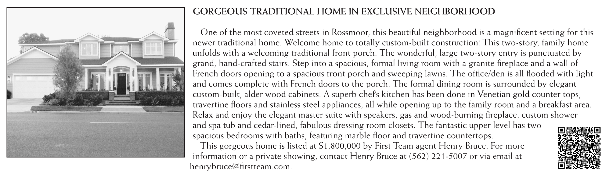 GORGEOUS TRADITIONAL HOME IN EXCLUSIVE NEIGHBORHOOD One of the most coveted streets in Rossmoor, this beautiful neighborhood is a magnifi cent setting for this newer traditional home. Welcome home to totally custom-built construction! This two-story, family home unfolds with a welcoming traditional front porch. The wonderful, large two-story entry is punctuated by grand, hand-crafted stairs. Step into a spacious, formal living room with a granite fi replace and a wall of French doors opening to a spacious front porch and sweeping lawns. The offi ce/den is all fl ooded with light and comes complete with French doors to the porch. The formal dining room is surrounded by elegant custom-built, alder wood cabinets. A superb chef’s kitchen has been done in Venetian gold counter tops, travertine fl oors and stainless steel appliances, all while opening up to the family room and a breakfast area. Relax and enjoy the elegant master suite with speakers, gas and wood-burning fi replace, custom shower and spa tub and cedar-lined, fabulous dressing room closets. The fantastic upper level has two spacious bedrooms with baths, featuring marble fl oor and travertine countertops. This gorgeous home is listed at $1,800,000 by First Team agent Henry Bruce. For more information or a private showing, contact Henry Bruce at (562) 221-5007 or via email at henrybruce@fi rstteam.com.
