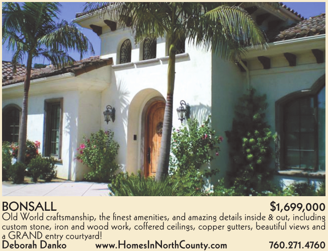 BONSALL $1,699,000 Old World craftsmanship, the finest amenities, and amazing details inside & out, including custom stone, iron and wood work, coffered ceilings, copper gutters, beautiful views and a GRAND entry courtyard! Deborah Danko www.HomesInNorthCounty.com 760.271.4760