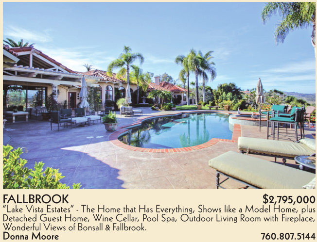 FALLBROOK $2,795,000 “Lake Vista Estates” - The Home that Has Everything, Shows like a Model Home, plus Detached Guest Home, Wine Cellar, Pool Spa, Outdoor Living Room with Fireplace, Wonderful Views of Bonsall & Fallbrook. Donna Moore 760.807.5144