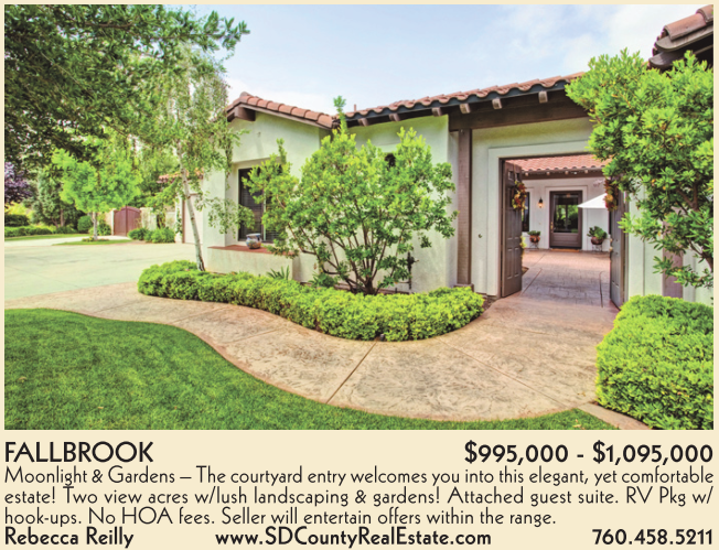 FALLBROOK $995,000 - $1,095,000 Moonlight & Gardens – The courtyard entry welcomes you into this elegant, yet comfortable estate! Two view acres w/lush landscaping & gardens! Attached guest suite. RV Pkg w/ hook-ups. No HOA fees. Seller will entertain offers within the range. Rebecca Reilly www.SDCountyRealEstate.com 760.458.5211