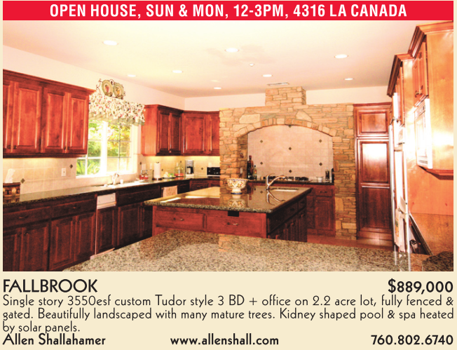 FALLBROOK $889,000 Single story 3550esf custom Tudor style 3 BD + office on 2.2 acre lot, fully fenced & gated. Beautifully landscaped with many mature trees. Kidney shaped pool & spa heated by solar panels. Allen Shallahamer www.allenshall.com 760.802.6740