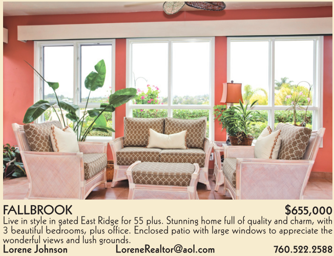 FALLBROOK $655,000 Live in style in gated East Ridge for 55 plus. Stunning home full of quality and charm, with 3 beautiful bedrooms, plus office. Enclosed patio with large windows to appreciate the wonderful views and lush grounds. Lorene Johnson LoreneRealtor@aol.com 760.522.2588