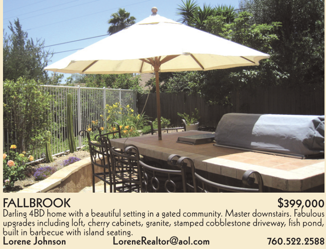 FALLBROOK $399,000 Darling 4BD home with a beautiful setting in a gated community. Master downstairs. Fabulous upgrades including loft, cherry cabinets, granite, stamped cobblestone driveway, fish pond, built in barbecue with island seating. Lorene Johnson LoreneRealtor@aol.com 760.522.2588