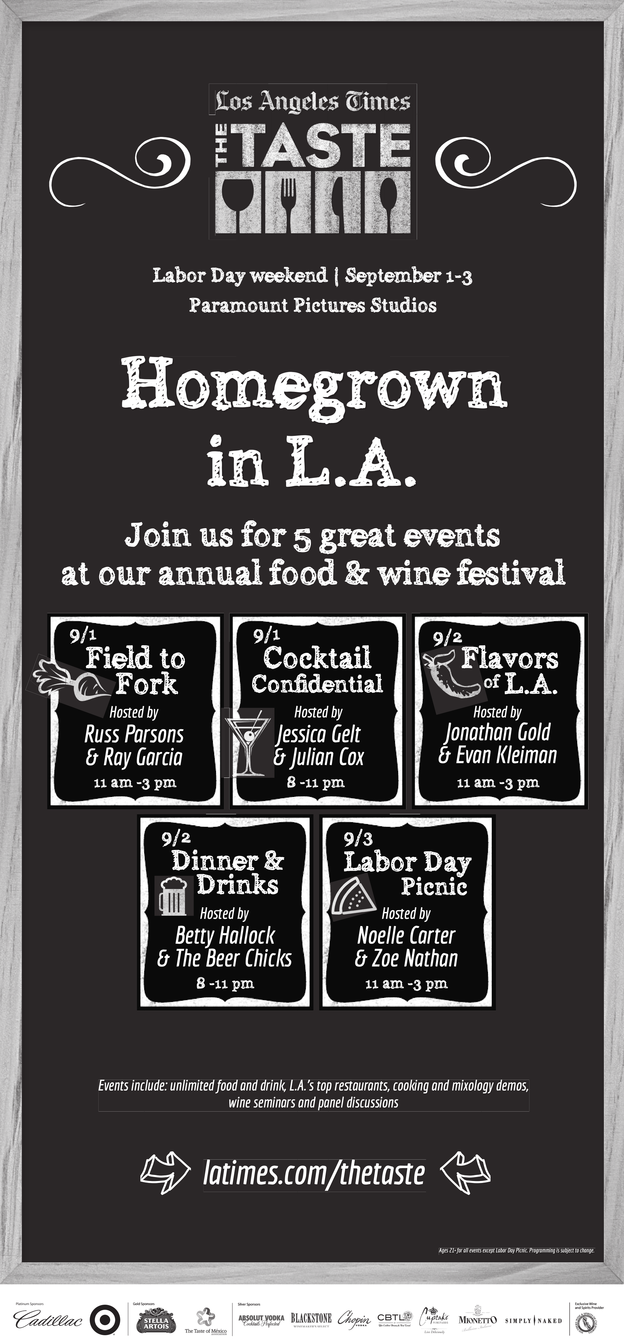 Events include: unlimited food and drink, L.A.’s top restaurants, cooking and mixology demos, wine seminars and panel discussions