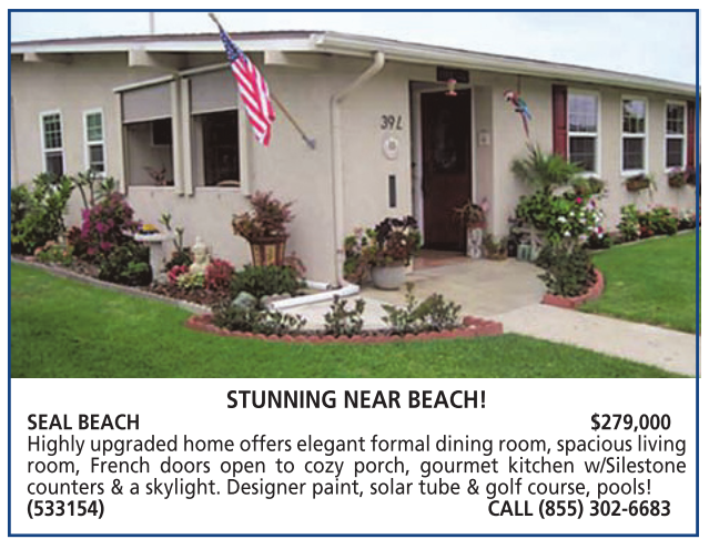 SEAL BEACH $279,000 Highly upgraded home offers elegant formal dining room, spacious living room, French doors open to cozy porch, gourmet kitchen w/Silestone counters & a skylight. Designer paint, solar tube & golf course, pools! (533154) CALL (855) 302-6683