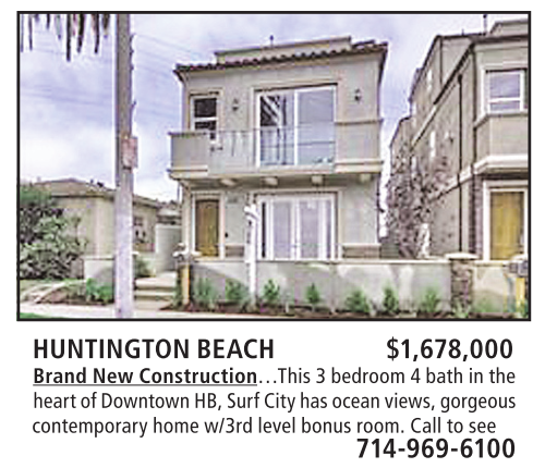 HUNTINGTON BEACH $1,678,000 Brand New Construction…This 3 bedroom 4 bath in the heart of Downtown HB, Surf City has ocean views, gorgeous contemporary home w/3rd level bonus room. Call to see 714-969-6100
