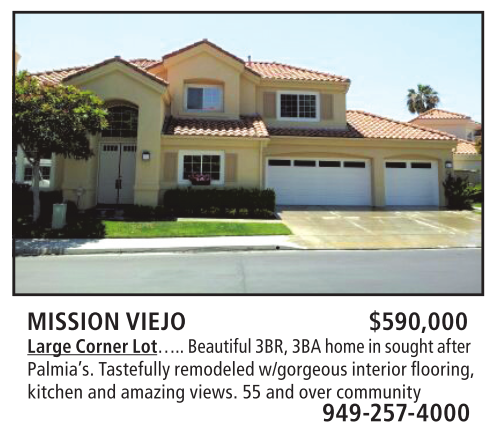 MISSION VIEJO $590,000 Large Corner Lot….. Beautiful 3BR, 3BA home in sought after Palmia’s. Tastefully remodeled w/gorgeous interior fl ooring, kitchen and amazing views. 55 and over community 949-257-4000