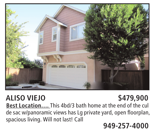 ALISO VIEJO $479,900 Best Location…. This 4bd/3 bath home at the end of the cul de sac w/panoramic views has Lg private yard, open fl oorplan, spacious living. Will not last! Call 949-257-4000