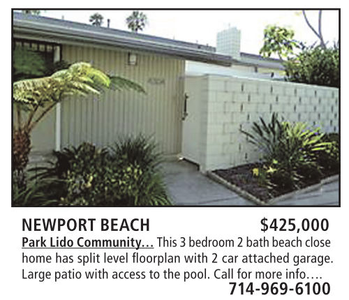 NEWPORT BEACH $425,000 Park Lido Community… This 3 bedroom 2 bath beach close home has split level fl oorplan with 2 car attached garage. Large patio with access to the pool. Call for more info….