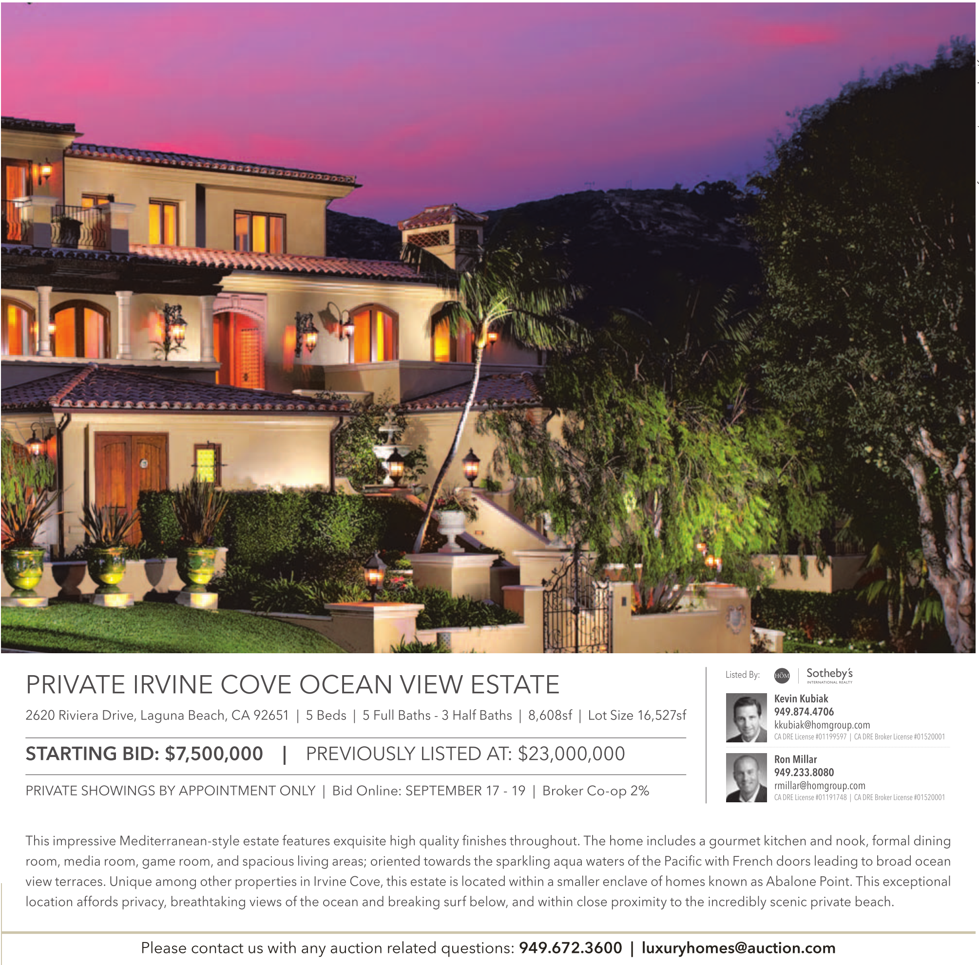 PRIVATE IRVINE COVE OCEAN VIEW ESTATE 2620 Riviera Drive, Laguna Beach, CA 92651 | 5 Beds | 5 Full Baths - 3 Half Baths | 8,608sf | Lot Size 16,527sf STARTING BID: $7,500,000 | PREVIOUSLY LISTED AT: $23,000,000 PRIVATE SHOWINGS BY APPOINTMENT ONLY | Bid Online: SEPTEMBER 17 - 19 | Broker Co-op 2% Listed By: Kevin Kubiak 949.874.4706 kkubiak@homgroup.com CA DRE License #01199597 | CA DRE Broker License #01520001 Ron Millar 949.233.8080 rmillar@homgroup.com CA DRE License #01191748 | CA DRE Broker License #01520001 This impressive Mediterranean-style estate features exquisite high quality finishes throughout. The home includes a gourmet kitchen and nook, formal dining room, media room, game room, and spacious living areas; oriented towards the sparkling aqua waters of the Pacific with French doors leading to broad ocean view terraces. Unique among other properties in Irvine Cove, this estate is located within a smaller enclave of homes known as Abalone Point. This exceptional location affords privacy, breathtaking views of the ocean and breaking surf below, and within close proximity to the incredibly scenic private beach. Please contact us with any auction related questions: 949.672.3600 | luxuryhomes@auction.com