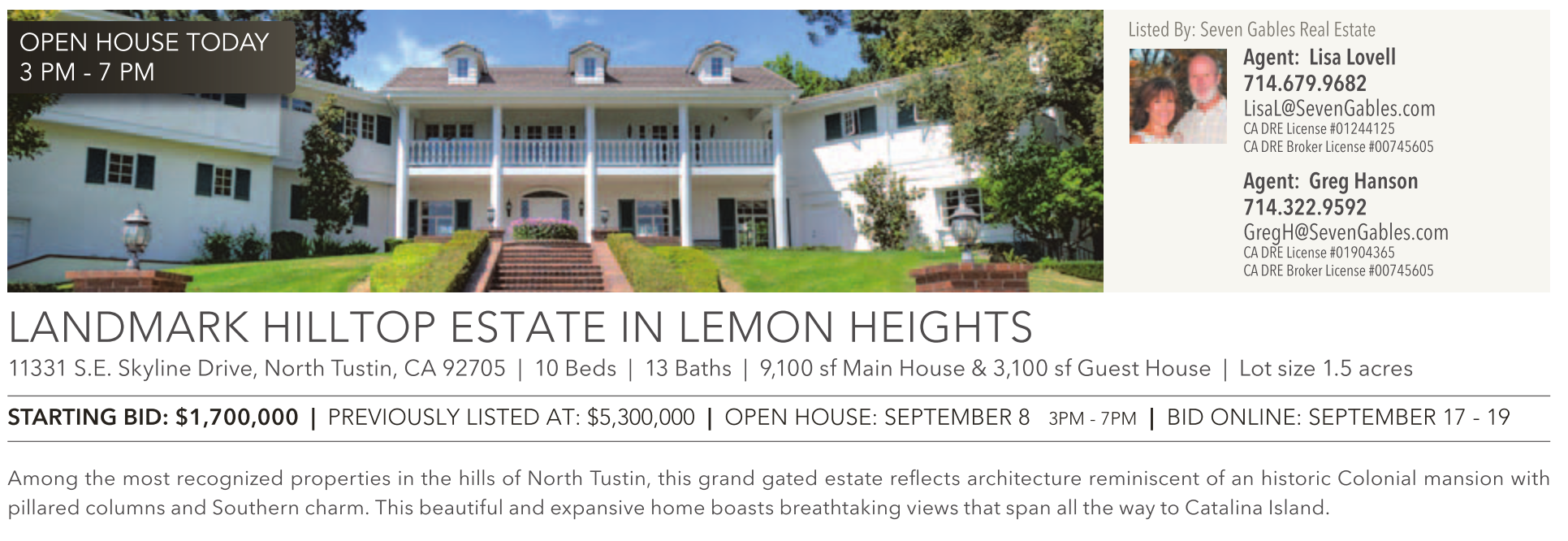 11331 S.E. Skyline Drive, North Tustin, CA 92705 | 10 Beds | 13 Baths | 9,100 sf Main House & 3,100 sf Guest House | Lot size 1.5 acres