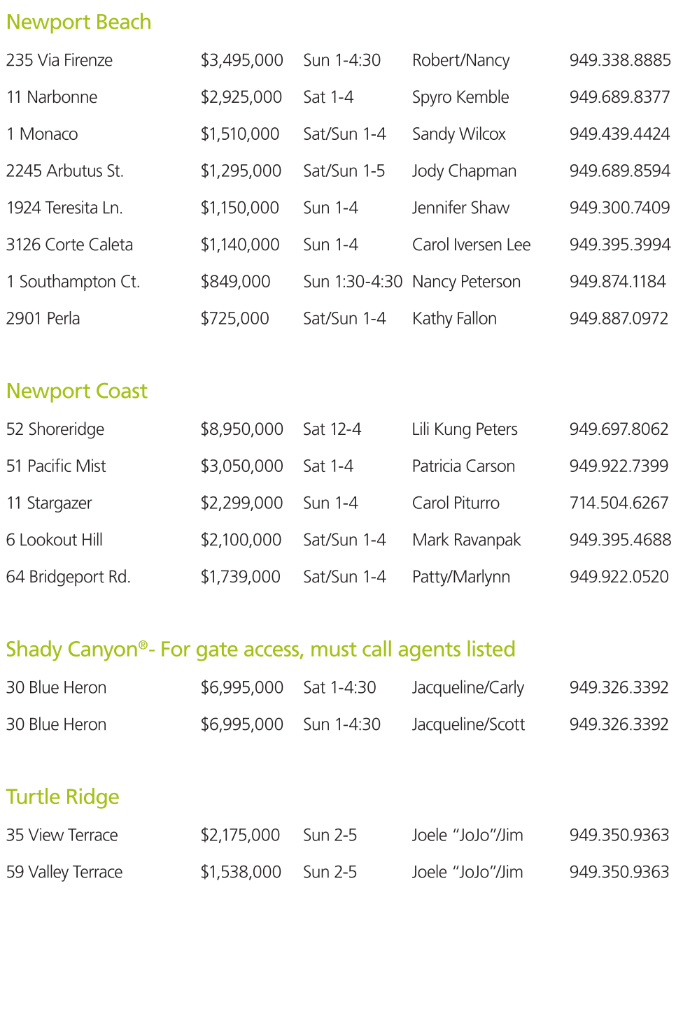 1924 Teresita Ln. $1,150,000 Sun 1-4 Jennifer Shaw 949.300.7409 3126 Corte Caleta $1,140,000 Sun 1-4 Carol Iversen Lee 949.395.3994 1 Southampton Ct. $849,000 Sun 1:30-4:30 Nancy Peterson 949.874.1184 2901 Perla $725,000 Sat/Sun 1-4 Kathy Fallon 949.887.0972