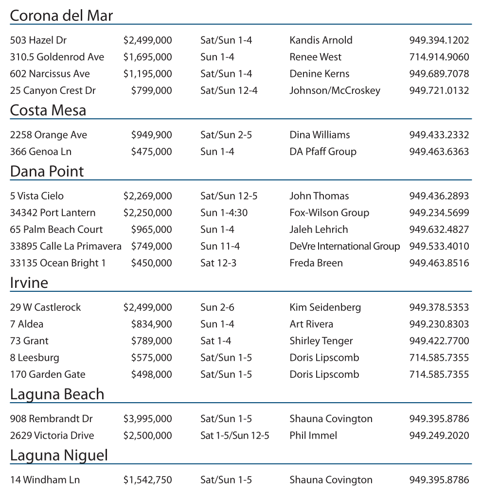 29 W Castlerock $2,499,000 Sun 2-6 Kim Seidenberg 949.378.5353 7 Aldea $834,900 Sun 1-4 Art Rivera 949.230.8303 73 Grant $789,000 Sat 1-4 Shirley Tenger 949.422.7700 8 Leesburg $575,000 Sat/Sun 1-5 Doris Lipscomb 714.585.7355 170 Garden Gate $498,000 Sat/Sun 1-5 Doris Lipscomb 714.585.7355