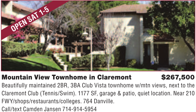 Mountain View Townhome in Claremont $267,500 Beautifully maintained 2BR, 3BA Club Vista townhome w/mtn views, next to the Claremont Club (Tennis/Swim). 1177 SF, garage & patio, quiet location. Near 210 FWY/shops/restaurants/colleges. 764 Danville. Call/text Camden Jansen 714-914-5954