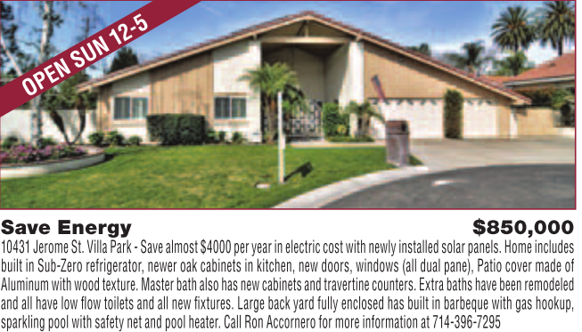 and all have low fl ow toilets and all new fi xtures. Large back yard fully enclosed has built in barbeque with gas hookup, sparkling pool with safety net and pool heater. Call Ron Accornero for more information at 714-396-7295