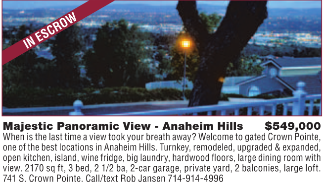 Majestic Panoramic View - Anaheim Hills $549,000 When is the last time a view took your breath away? Welcome to gated Crown Pointe, one of the best locations in Anaheim Hills. Turnkey, remodeled, upgraded & expanded, open kitchen, island, wine fridge, big laundry, hardwood floors, large dining room with view. 2170 sq ft, 3 bed, 2 1/2 ba, 2-car garage, private yard, 2 balconies, large loft. 741 S. Crown Pointe. Call/text Rob Jansen 714-914-4996