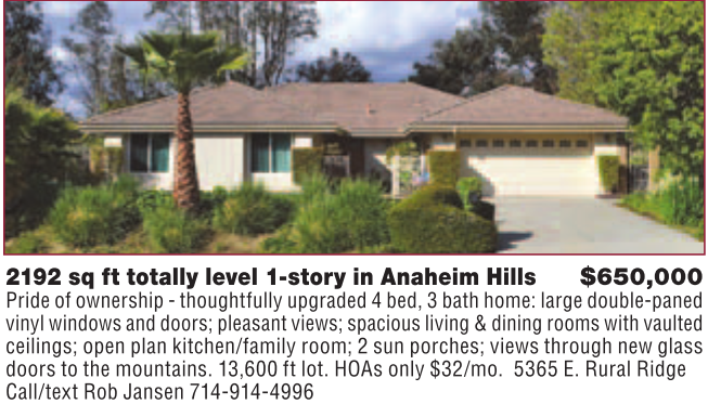 2192 sq ft totally level 1-story in Anaheim Hills $650,000 Pride of ownership - thoughtfully upgraded 4 bed, 3 bath home: large double-paned