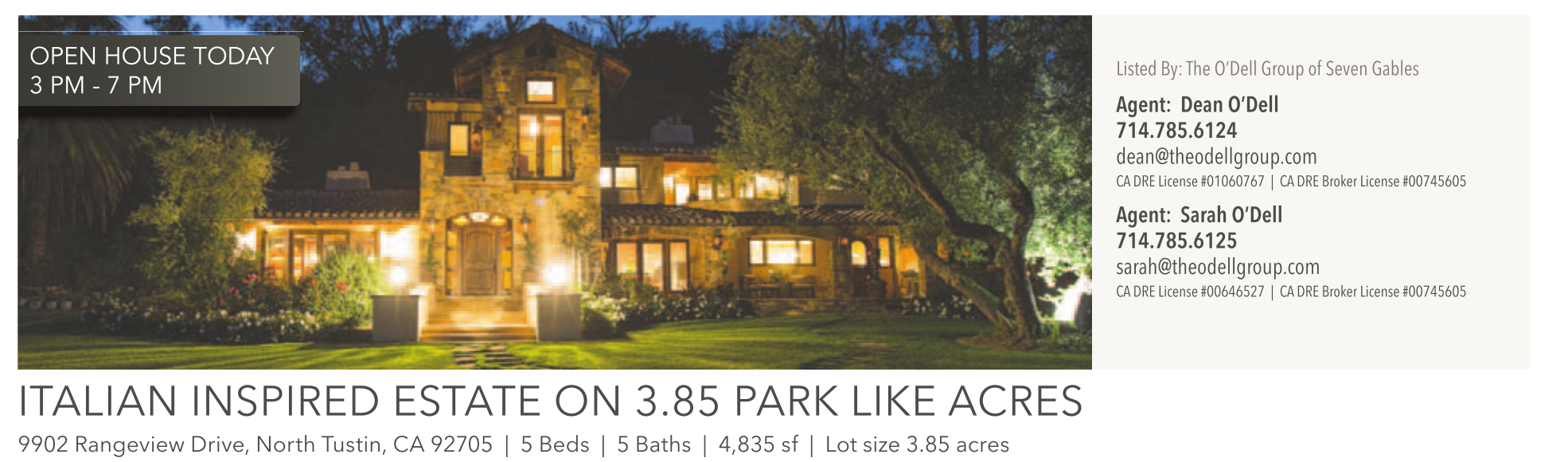 OPEN HOUSE TODAY 3 PM - 7 PM Listed By: The O’Dell Group of Seven Gables Agent: Dean O’Dell 714.785.6124 dean@theodellgroup.com CA DRE License #01060767 | CA DRE Broker License #00745605 Agent: Sarah O’Dell 714.785.6125 sarah@theodellgroup.com CA DRE License #00646527 | CA DRE Broker License #00745605 ITALIAN INSPIRED ESTATE ON 3.85 PARK LIKE ACRES 9902 Rangeview Drive, North Tustin, CA 92705 | 5 Beds | 5 Baths | 4,835 sf | Lot size 3.85 acres See also