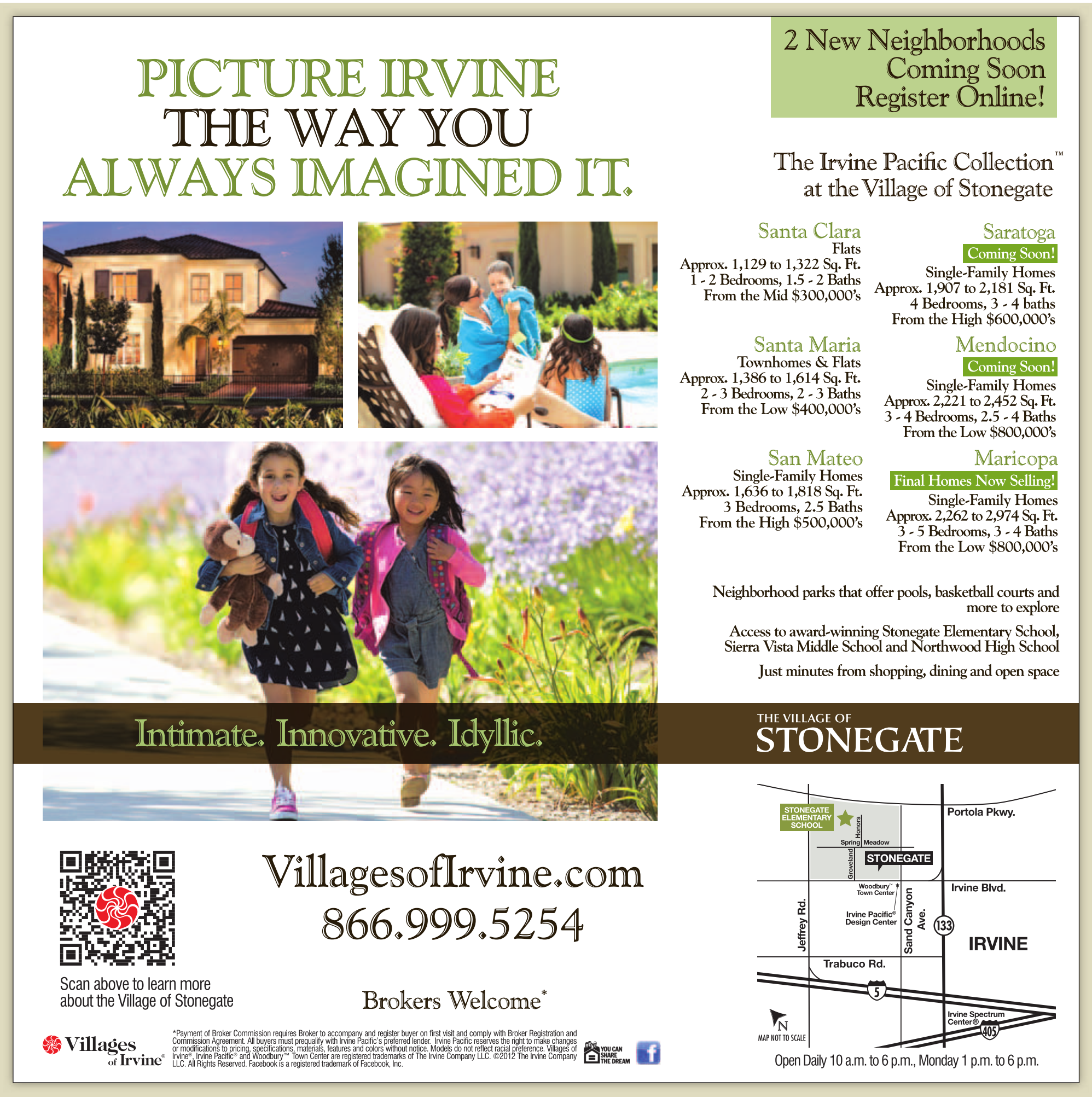 *Payment of Broker Commission requires Broker to accompany and register buyer on first visit and comply with Broker Registration and Commission Agreement. All buyers must prequalify with Irvine Pacific’s preferred lender. Irvine Pacific reserves the right to make changes or modifications to pricing, specifications, materials, features and colors without notice. Models do not reflect racial preference. Villages of Irvine ® , Irvine Pacific ® and Woodbury™ Town Center are registered trademarks of The Irvine Company LLC. ©2012 The Irvine Company LLC. All Rights Reserved. Facebook is a registered trademark of Facebook, Inc.