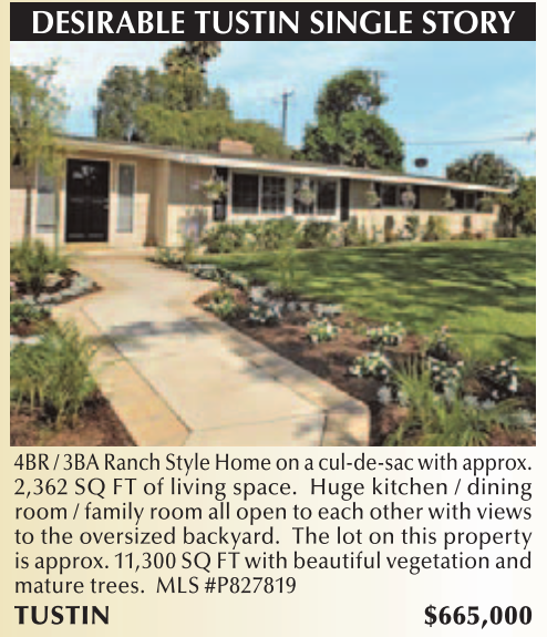 4BR / 3BA Ranch Style Home on a cul-de-sac with approx. 2,362 SQ FT of living space. Huge kitchen / dining room / family room all open to each other with views to the oversized backyard. The lot on this property is approx. 11,300 SQ FT with beautiful vegetation and mature trees. MLS #P827819 TUSTIN $665,000