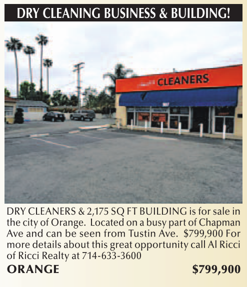 DRY CLEANING BUSINESS & BUILDING! DRY CLEANERS & 2,175 SQ FT BUILDING is for sale in the city of Orange. Located on a busy part of Chapman Ave and can be seen from Tustin Ave. $799,900 For more details about this great opportunity call Al Ricci of Ricci Realty at 714-633-3600 ORANGE $799,900