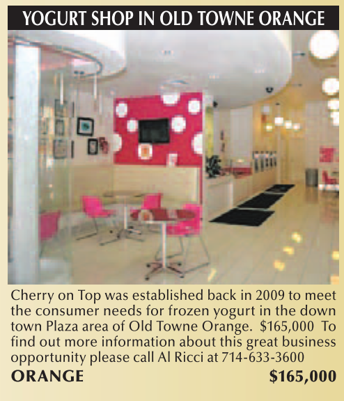 YOGURT SHOP IN OLD TOWNE ORANGE Cherry on Top was established back in 2009 to meet the consumer needs for frozen yogurt in the down town Plaza area of Old Towne Orange. $165,000 To find out more information about this great business opportunity please call Al Ricci at 714-633-3600 ORANGE $165,000