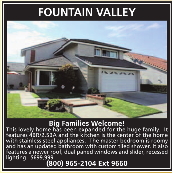 FOUNTAIN VALLEY Big Families Welcome! This lovely home has been expanded for the huge family. It features 4BR/2.5BA and the kitchen is the center of the home with stainless steel appliances. The master bedroom is roomy and has an updated bathroom with custom tiled shower. It also features a newer roof, dual paned windows and slider, recessed lighting. $699,999 (800) 965-2104 Ext 9660 See also
