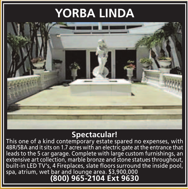 YORBA LINDA Spectacular! This one of a kind contemporary estate spared no expenses, with 4BR/5BA and it sits on 1.7 acres with an electric gate at the entrance that leads to the 5 car garage. Complete with large custom furnishings, an extensive art collection, marble bronze and stone statues throughout, built-in LED TV’s, 4 Fireplaces, slate floors surround the inside pool, spa, atrium, wet bar and lounge area. $3,900,000 (800) 965-2104 Ext 9630