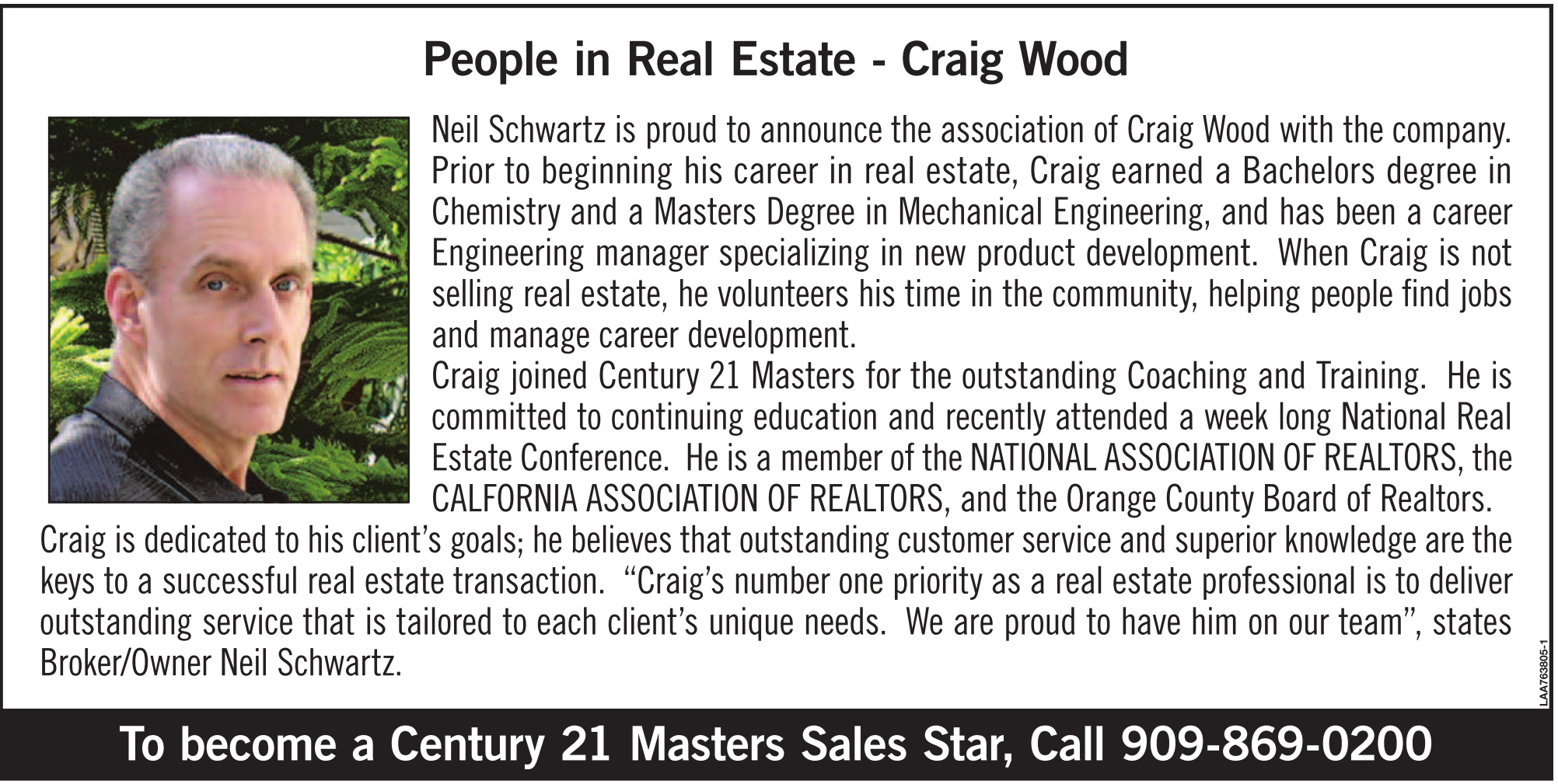 Neil Schwartz is proud to announce the association of Craig Wood with the company. Prior to beginning his career in real estate, Craig earned a Bachelors degree in Chemistry and a Masters Degree in Mechanical Engineering, and has been a career Engineering manager specializing in new product development. When Craig is not selling real estate, he volunteers his time in the community, helping people find jobs and manage career development. Craig joined Century 21 Masters for the outstanding Coaching and Training. He is committed to continuing education and recently attended a week long National Real Estate Conference. He is a member of the NATIONAL ASSOCIATION OF REALTORS, the CALFORNIA ASSOCIATION OF REALTORS, and the Orange County Board of Realtors.