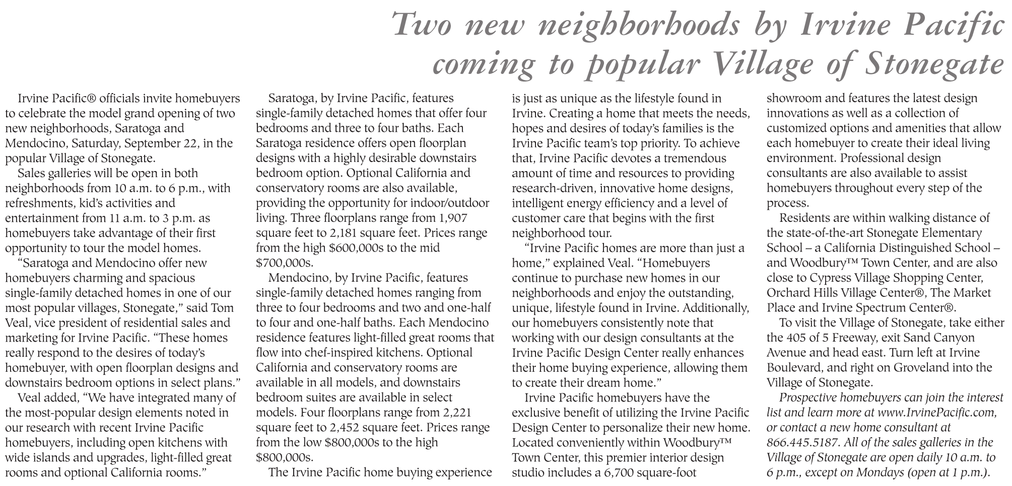 Irvine Pacific® officials invite homebuyers to celebrate the model grand opening of two new neighborhoods, Saratoga and Mendocino, Saturday, September 22, in the popular Village of Stonegate.