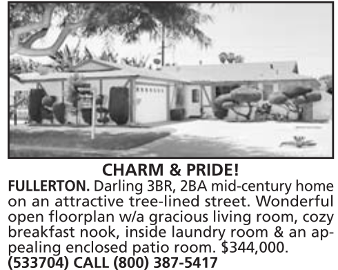CHARM & PRIDE! FULLERTON. Darling 3BR, 2BA mid-century home on an attractive tree-lined street. Wonderful open floorplan w/a gracious living room, cozy breakfast nook, inside laundry room & an appealing enclosed patio room. $344,000. (533704) CALL (800) 387-5417