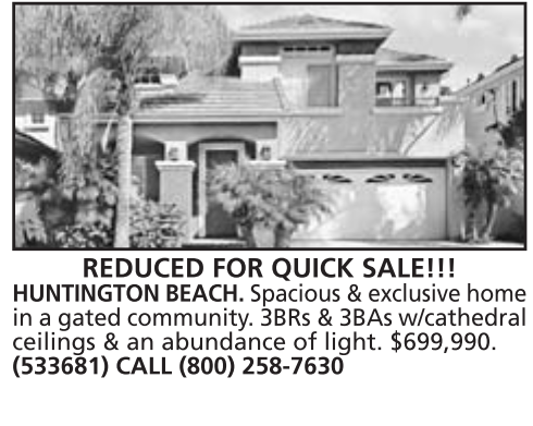 HUNTINGTON BEACH. Spacious & exclusive home in a gated community. 3BRs & 3BAs w/cathedral ceilings & an abundance of light. $699,990. (533681) CALL (800) 258-7630