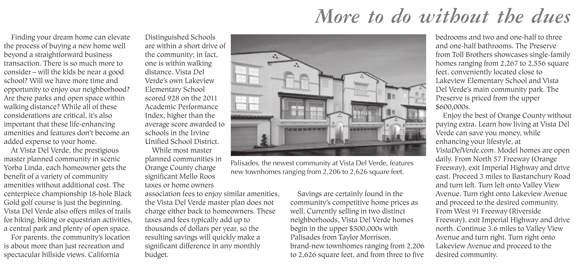 Enjoy the best of Orange County without paying extra. Learn how living at Vista Del Verde can save you money, while enhancing your lifestyle, at VistaDelVerde.com. Model homes are open daily. From North 57 Freeway (Orange Freeway), exit Imperial Highway and drive east. Proceed 3 miles to Bastanchury Road and turn left. Turn left onto Valley View Avenue. Turn right onto Lakeview Avenue and proceed to the desired community. From West 91 Freeway (Riverside Freeway), exit Imperial Highway and drive north. Continue 3.6 miles to Valley View Avenue and turn right. Turn right onto Lakeview Avenue and proceed to the desired community.