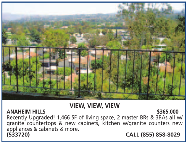 VIEW, VIEW, VIEW ANAHEIM HILLS $365,000 Recently Upgraded! 1,466 SF of living space, 2 master BRs & 3BAs all w/ granite countertops & new cabinets, kitchen w/granite counters new appliances & cabinets & more. (533720) CALL (855) 858-8029