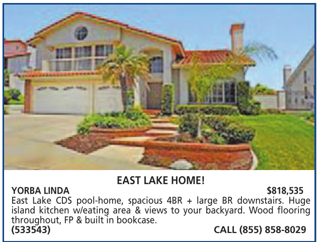 YORBA LINDA $818,535 East Lake CDS pool-home, spacious 4BR + large BR downstairs. Huge island kitchen w/eating area & views to your backyard. Wood flooring throughout, FP & built in bookcase. (533543) CALL (855) 858-8029
