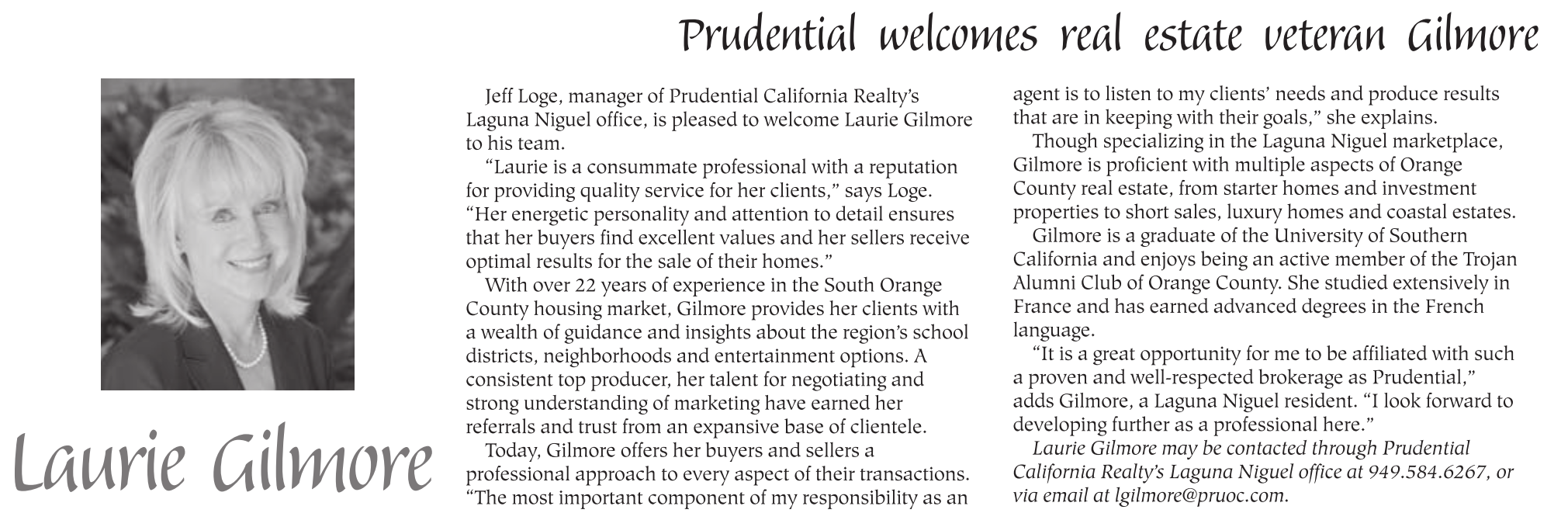 Laurie Gilmore may be contacted through Prudential California Realty’s Laguna Niguel office at 949.584.6267, or via email at lgilmore@pruoc.com.