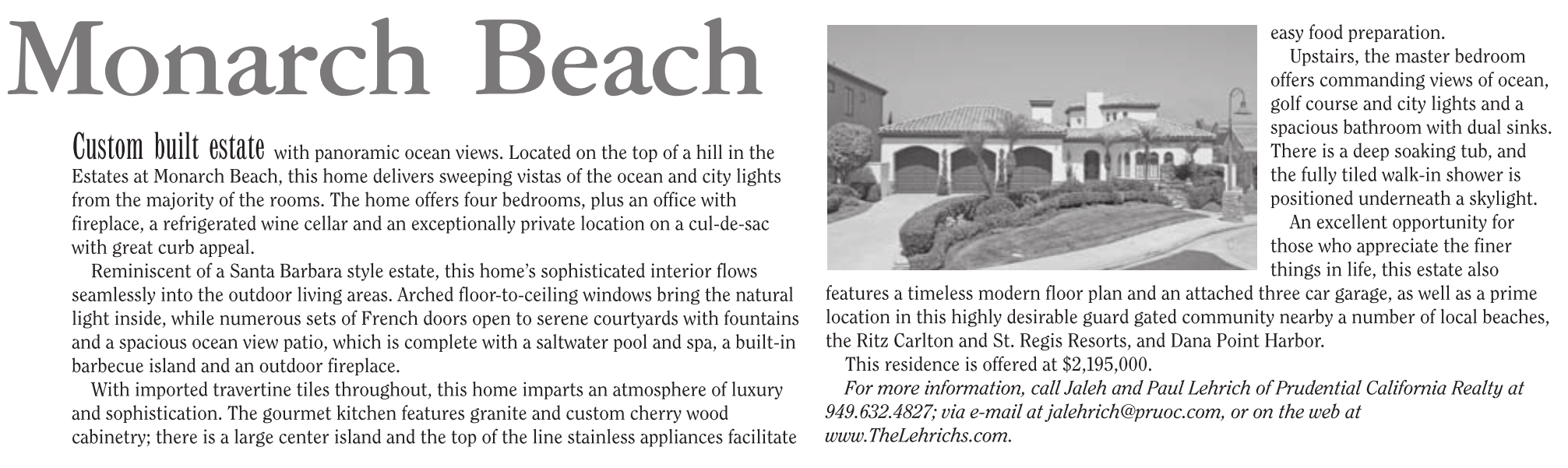 This residence is offered at $2,195,000. For more information, call Jaleh and Paul Lehrich of Prudential California Realty at 949.632.4827; via e-mail at jalehrich@pruoc.com, or on the web at www.TheLehrichs.com.