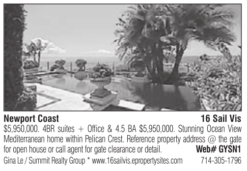 Newport Coast 16 Sail Vis $5,950,000. 4BR suites + Office & 4.5 BA $5,950,000. Stunning Ocean View Mediterranean home within Pelican Crest. Reference property address @ the gate for open house or call agent for gate clearance or detail. Web# GYSN1