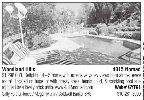 Woodland Hills 4815 Nomad $1,298,000. Delightful 4+5 home with expansive valley views from almost every room! Located on huge lot with grassy areas, tennis court, & sparkling pool surrounded by a lovely brick patio. www.4815nomad.com Web# GYTK1 Sally Forster Jones / Megan Martin/ Coldwell Banker BHS 310-281-3999