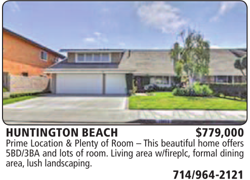 HUNTINGTON BEACH $779,000 Prime Location & Plenty of Room – This beautiful home offers 5BD/3BA and lots of room. Living area w/fireplc, formal dining area, lush landscaping.