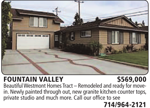 FOUNTAIN VALLEY $569,000 Beautiful Westmont Homes Tract – Remodeled and ready for movein. Newly painted through out, new granite kitchen counter tops, private studio and much more. Call our office to see 714/964-2121