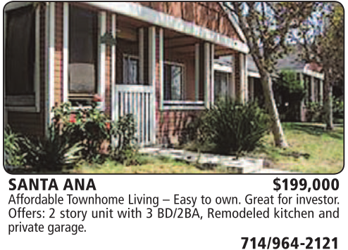 SANTA ANA $199,000 Affordable Townhome Living – Easy to own. Great for investor. Offers: 2 story unit with 3 BD/2BA, Remodeled kitchen and private garage.
