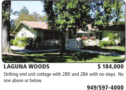 LAGUNA WOODS $ 184,000 Striking end unit cottage with 2BD and 2BA with no steps No one above or below.